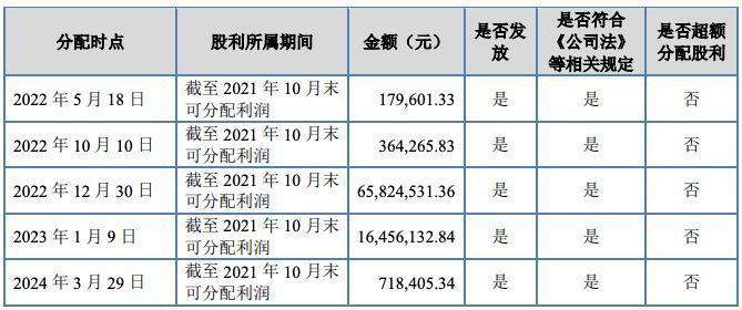 根据招股书,2021年11月1日,双祺有限召开股东会,经与会股东一致同意,向股东商积童、杜冬芹派发现金股利1.6亿元,双祺有限于2021年支付现金股利76,457,063.30元,剩余股利于2022年、2023年、2024年支付。截至招股说明书签署日,上述股