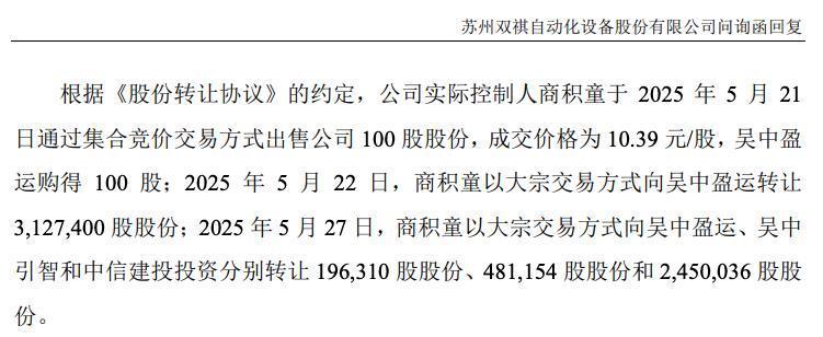 12月5日,北交所更新上市申请审核动态,苏州双祺自动化设备股份有限公司(以下简称“苏州双祺”或“发行人”)已回复第一轮审核问询函,回复的问题主要包括实际控制人认定与控制权稳定性、关联交易的公允性、业绩增长的真实性和合理性,以及募投项目必要性与合理性等11个问题。